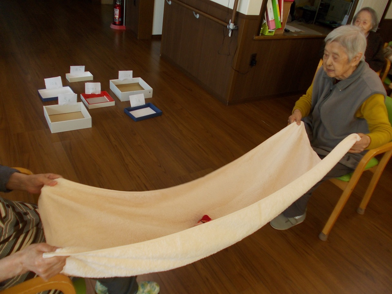 バスタオルとお手玉を使い